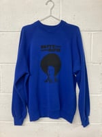 Hand screen printed on a blue preloved vintage sweat with black eco ink.