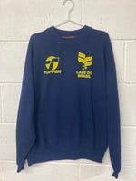 Hand screen printed on a blue preloved vintage sweat with yellow eco ink.