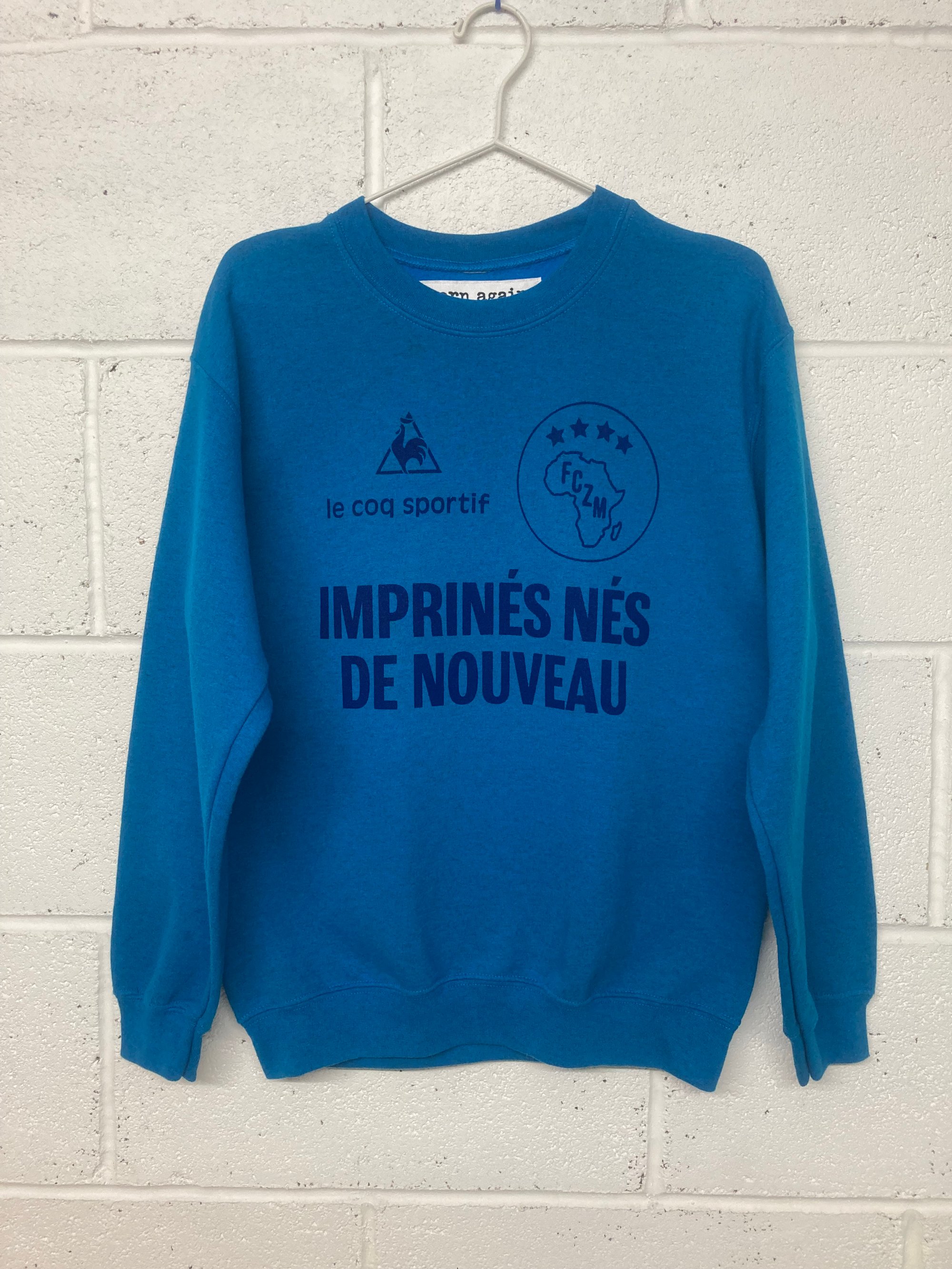 Hand screen printed on a blue preloved vintage sweat with blue eco ink.