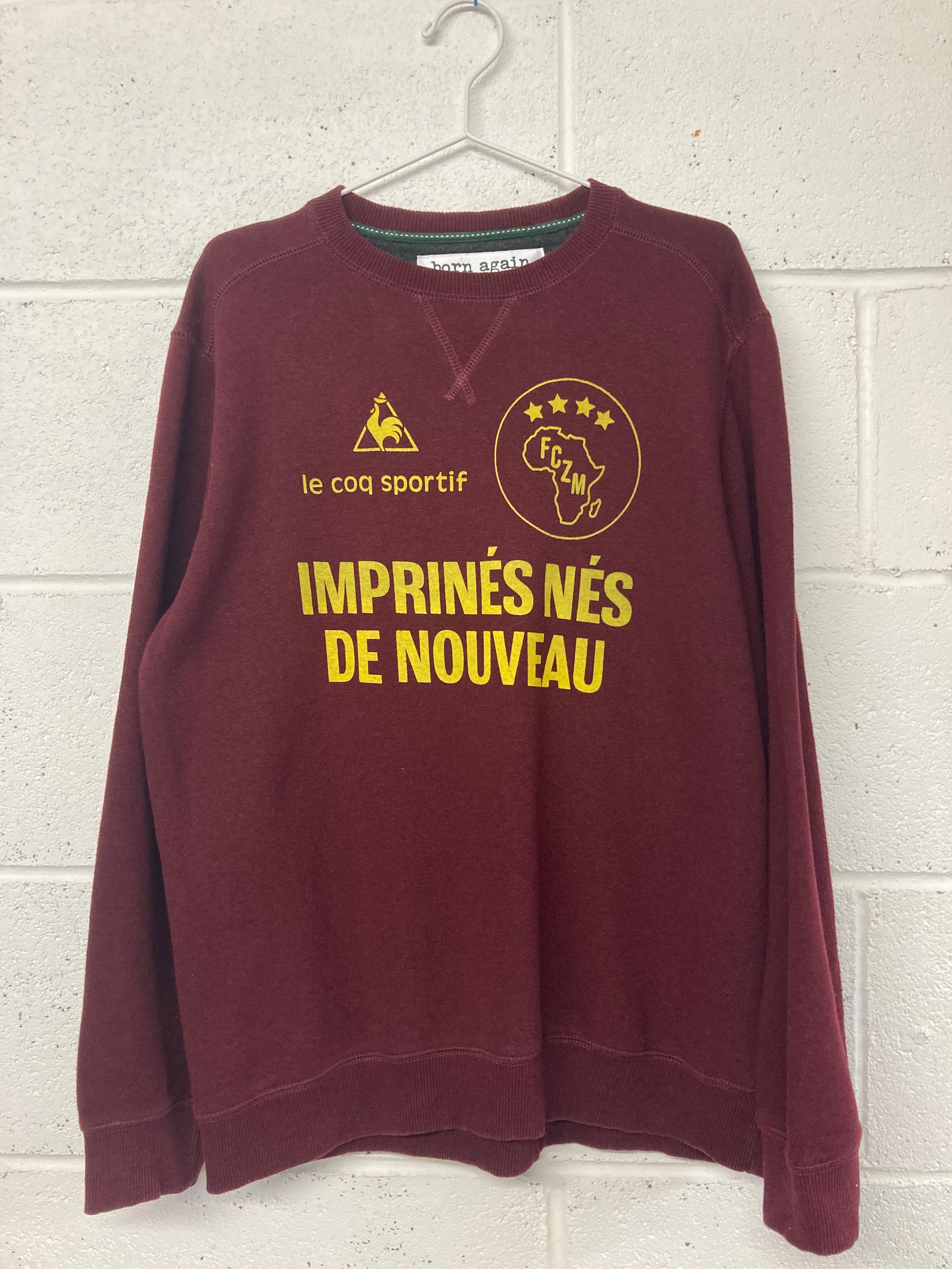 Hand screen printed on a maroon preloved vintage sweat with yellow eco ink.