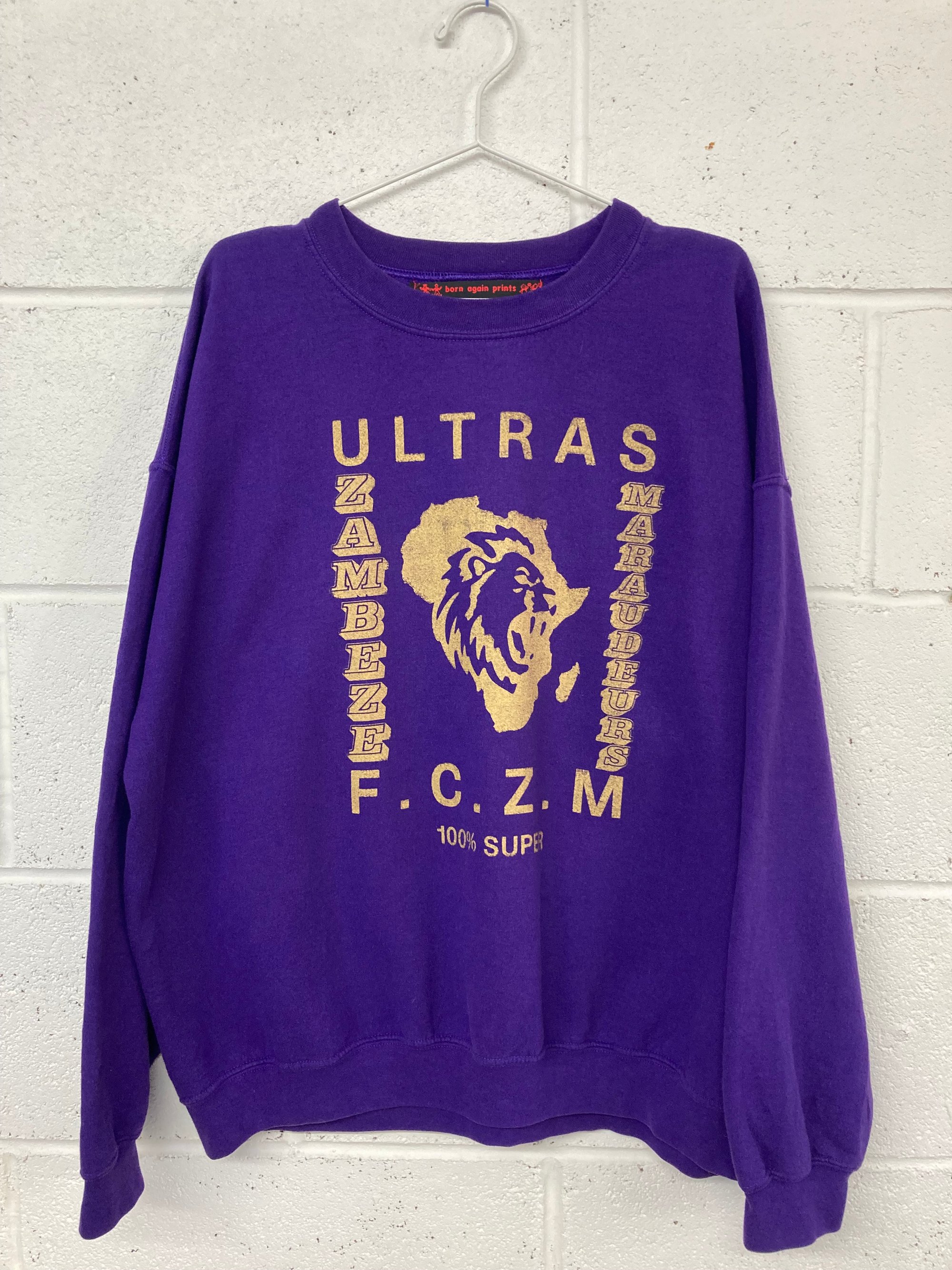 Hand screen printed on a purple preloved vintage sweat with gold eco ink.