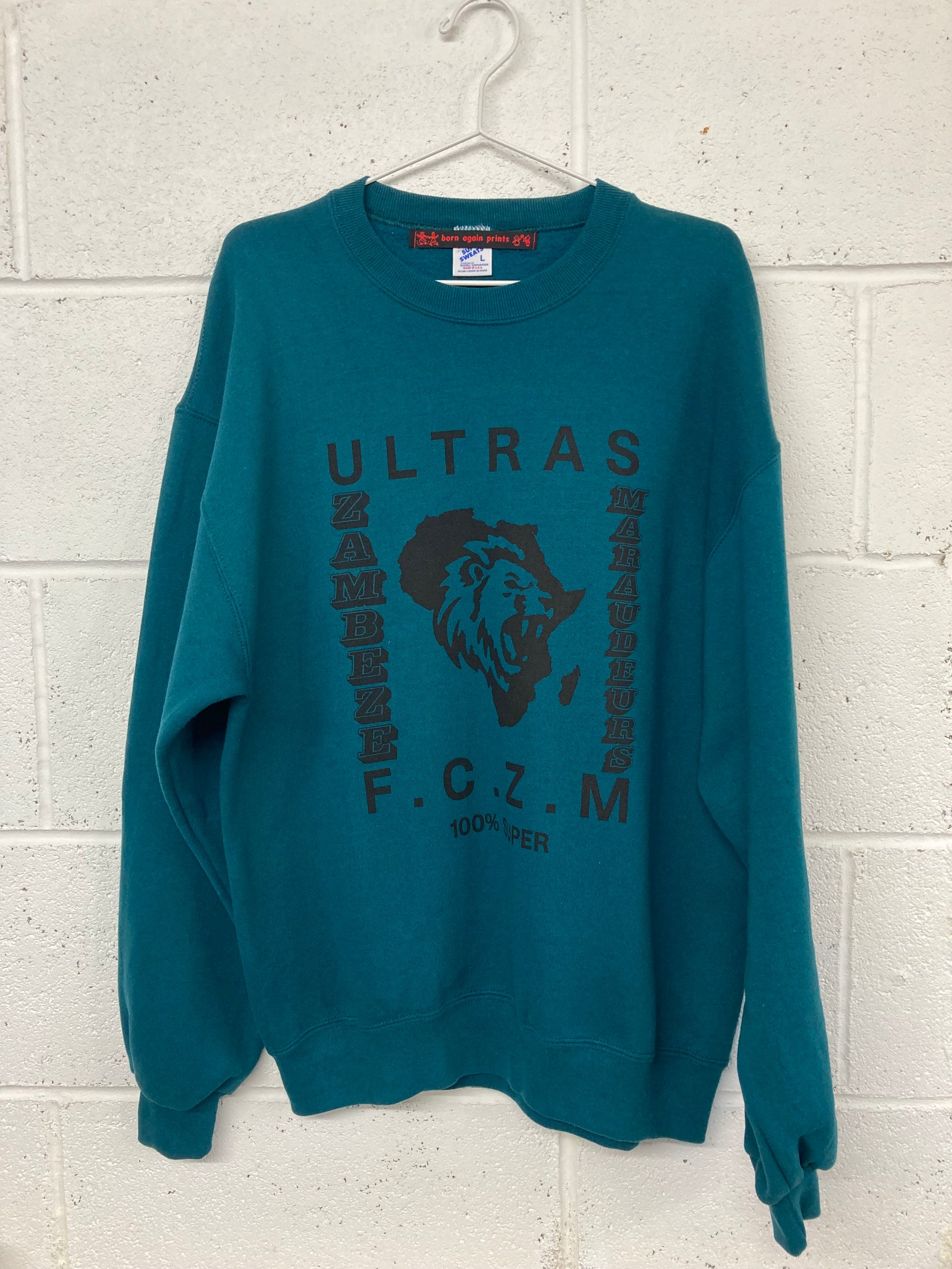 Hand screen printed on a teal preloved vintage sweat with black eco ink.