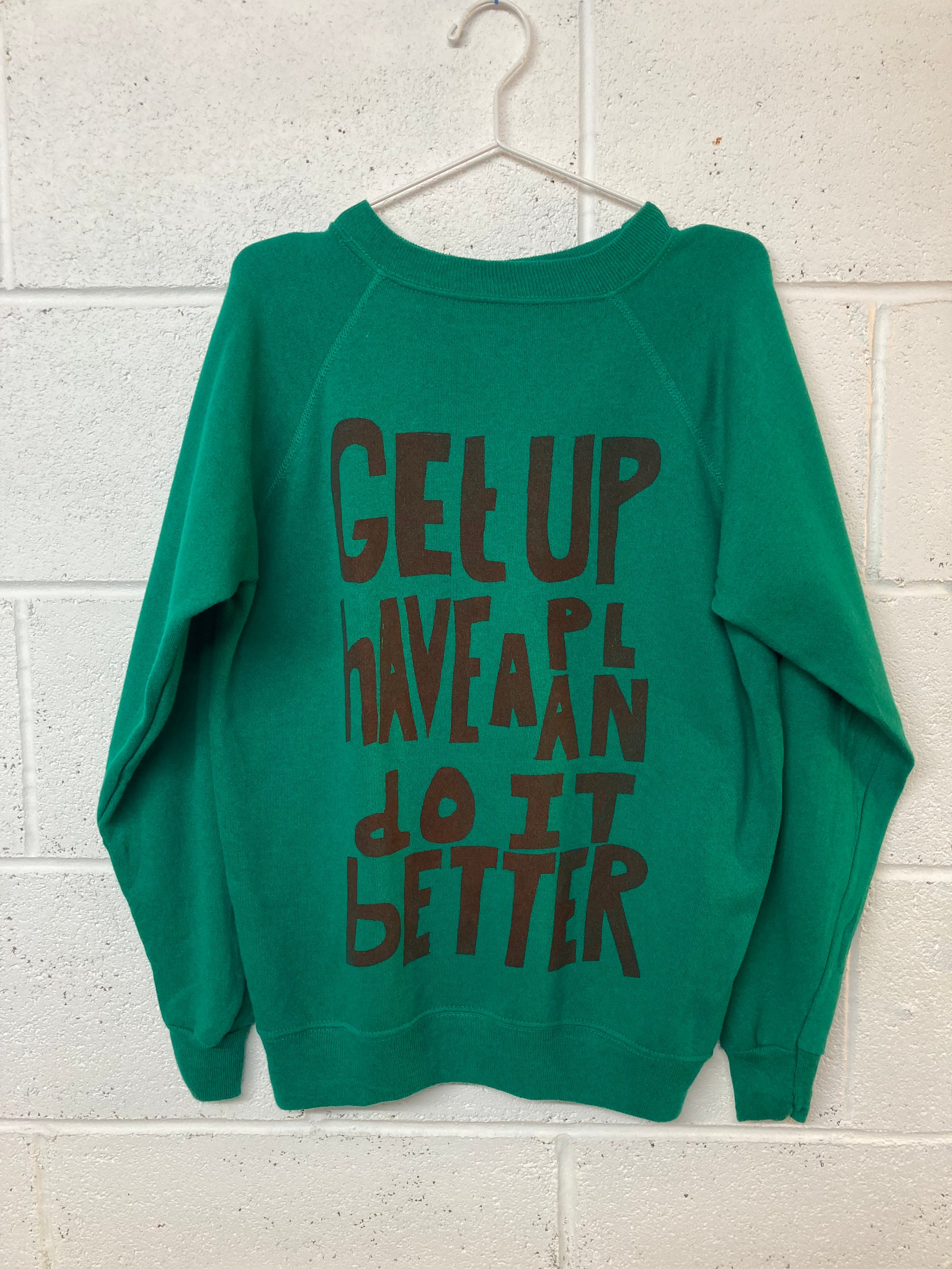 Hand screen printed on a green preloved vintage sweat with red eco ink.