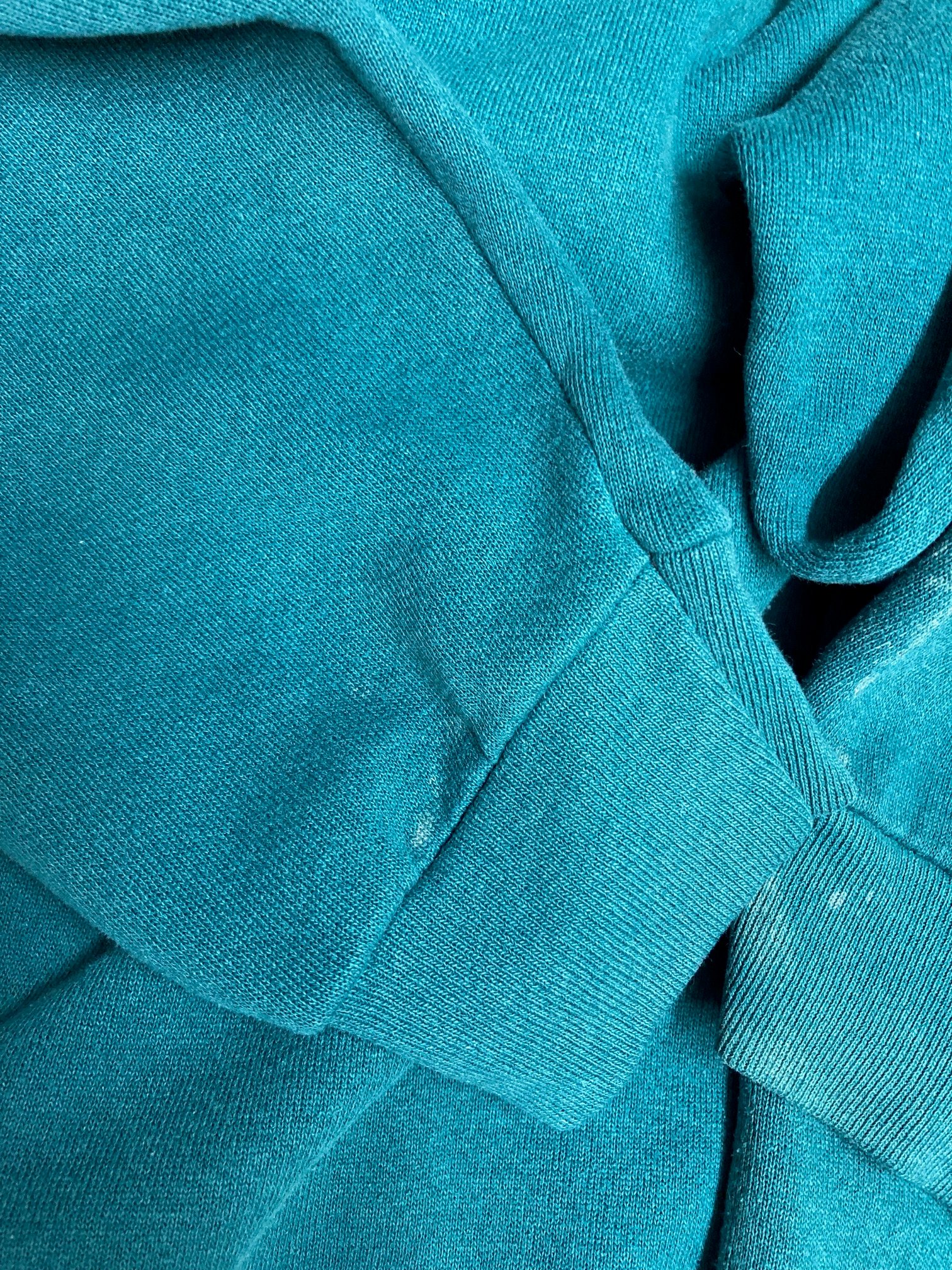 Because our sweats are vintage and preloved they may show signs of wear e.g bobbles/small marks. We have tried our best to highlight anything obvious in the photos. This top has enjoyed an action packed previous life so shows some staining on the bottom of each sleeve (see pics) so it's cheaper.