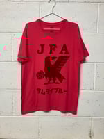 Hand screen printed on a pink preloved vintage T shirt with red eco ink.
