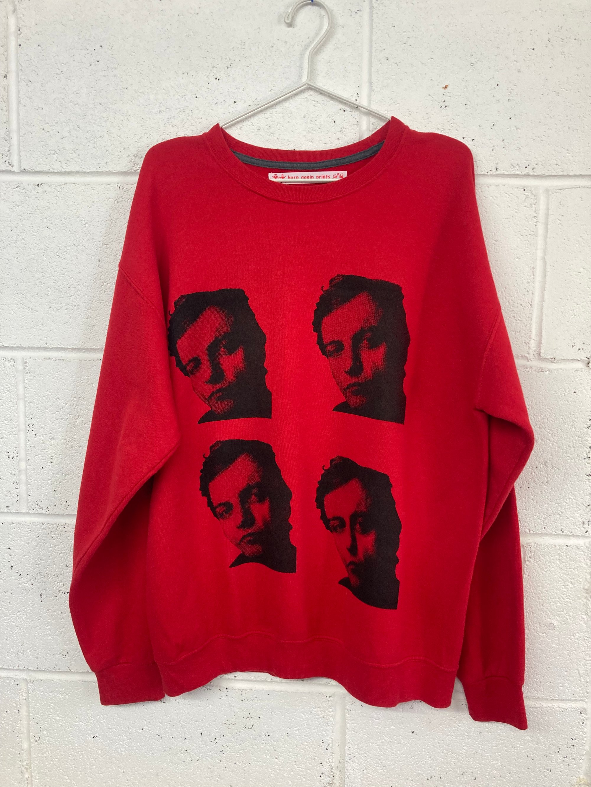 Hand screen printed on a red preloved vintage sweat with black eco ink.