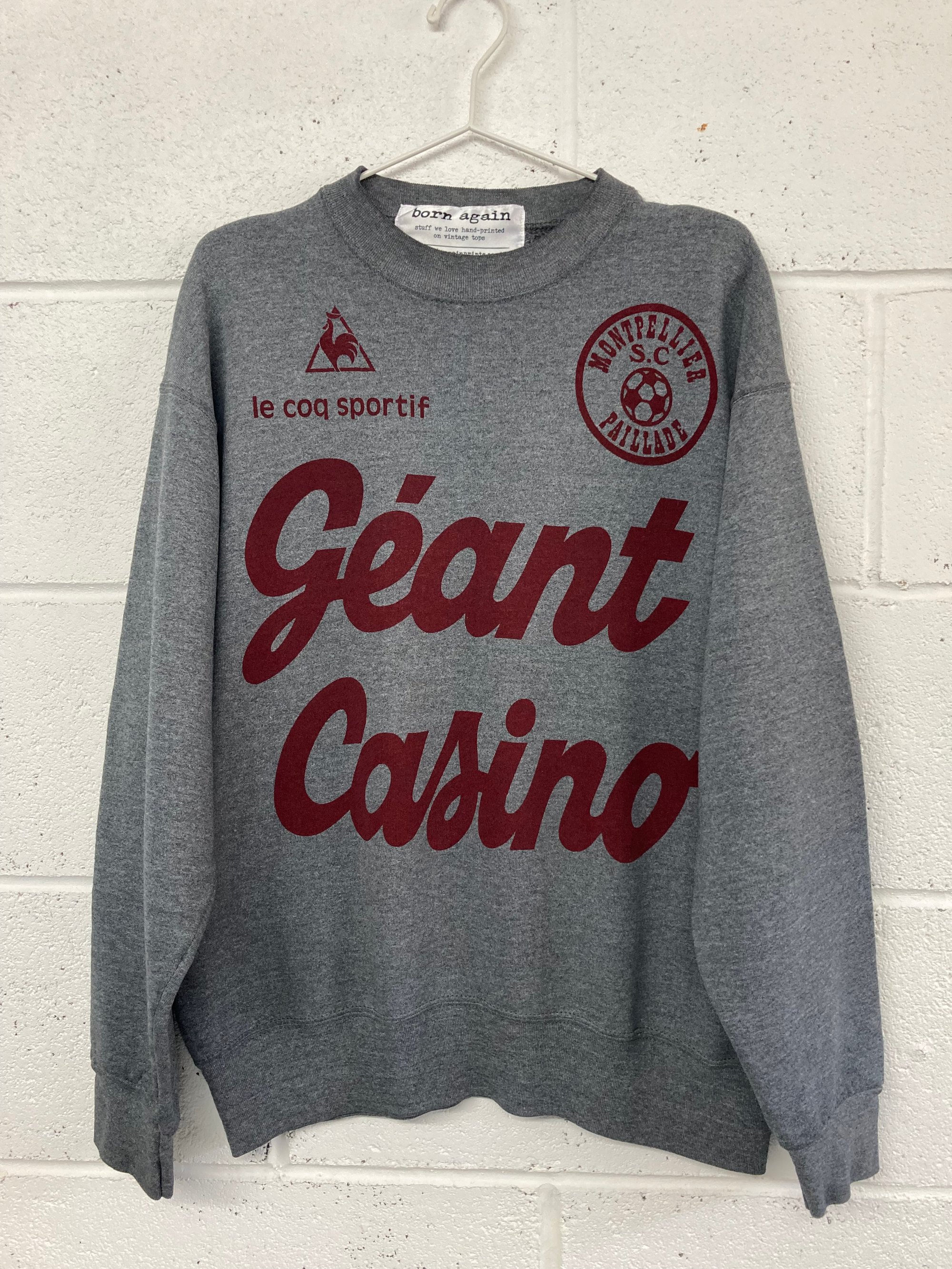 It’s funny how early memories and impressions stick with you. As a football bonkers kid I used to wear footy kits or trackies all the time. Mostly full kit but sometimes I’d mix and match I’d loved it. When there was an international tournament or European match televised I’d be glued to the TV. I would see all these amazing kits and manufacturers. I remember the 82 World Cup thinking how gorgeous all the Le Coq Sportif kits were for Spain, Argentina,Cameroon. They were so cool. When I’d watch a European match I’d be intrigued why sometimes the club badge and sponsor were all so big. The team names were cool as well: St Etienne, Anderlecht, FC St Gallen, Feyenoord, Honved, Dynamo Dresden etc etc. I absolutely fell in love with massive badges and sponsors. It didn’t catch on with English teams sorry to say. They were always quite apologetic on the shirt. Doing some research on massive club badges and sponsors I found a 1980/81 Montpellier La Paillade shirt with the holy trinity: enlarged Le Coq Sportif logo, massive club badge and gigantic Geant Casino sponsor so I printed some.