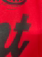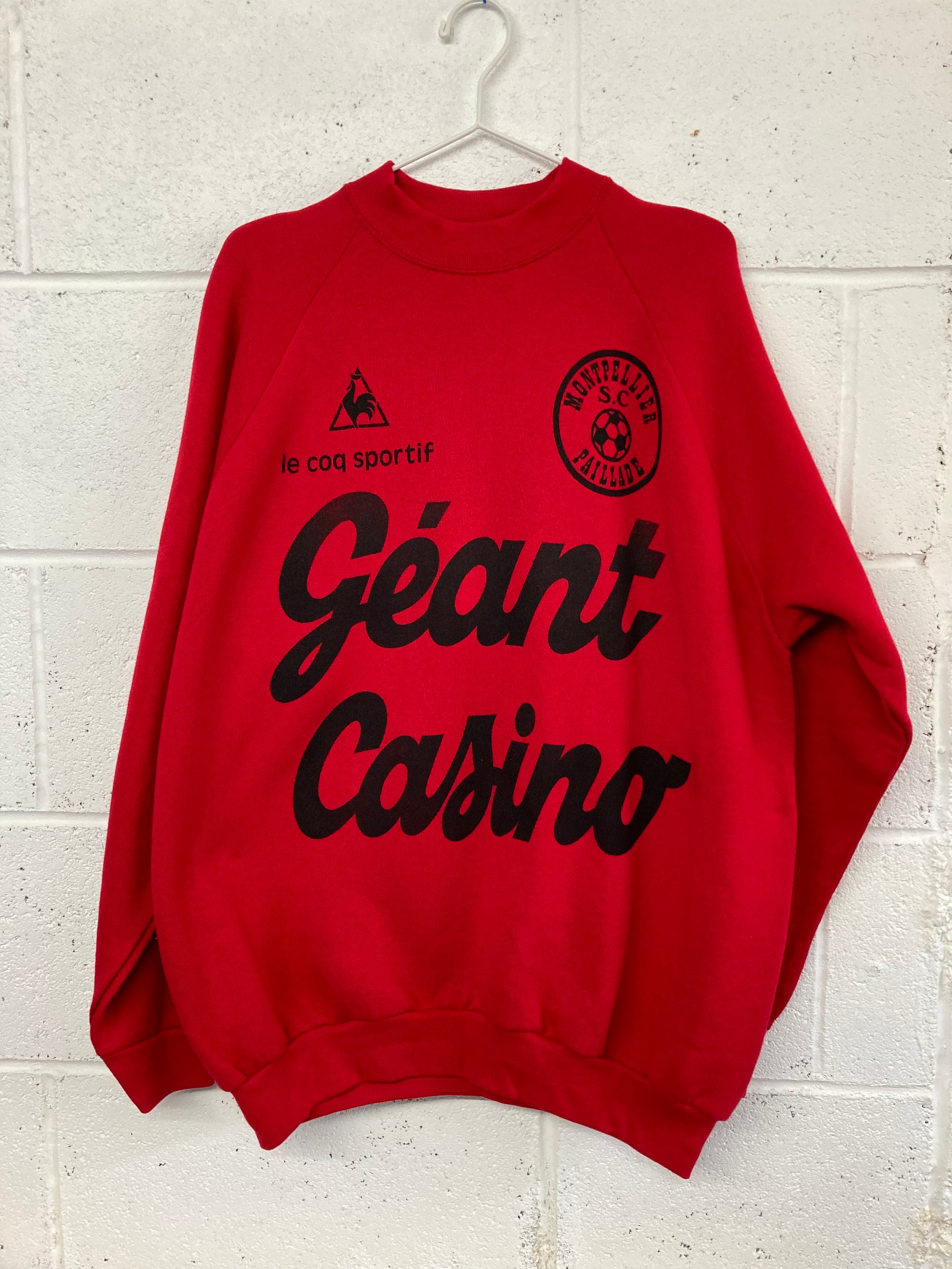 It’s funny how early memories and impressions stick with you. As a football bonkers kid I used to wear footy kits or trackies all the time. Mostly full kit but sometimes I’d mix and match I’d loved it. When there was an international tournament or European match televised I’d be glued to the TV. I would see all these amazing kits and manufacturers. I remember the 82 World Cup thinking how gorgeous all the Le Coq Sportif kits were for Spain, Argentina,Cameroon. They were so cool. When I’d watch a European match I’d be intrigued why sometimes the club badge and sponsor were all so big. The team names were cool as well: St Etienne, Anderlecht, FC St Gallen, Feyenoord, Honved, Dynamo Dresden etc etc. I absolutely fell in love with massive badges and sponsors. It didn’t catch on with English teams sorry to say. They were always quite apologetic on the shirt. Doing some research on massive club badges and sponsors I found a 1980/81 Montpellier La Paillade shirt with the holy trinity: enlarged Le Coq Sportif logo, massive club badge and gigantic Geant Casino sponsor so I printed some.