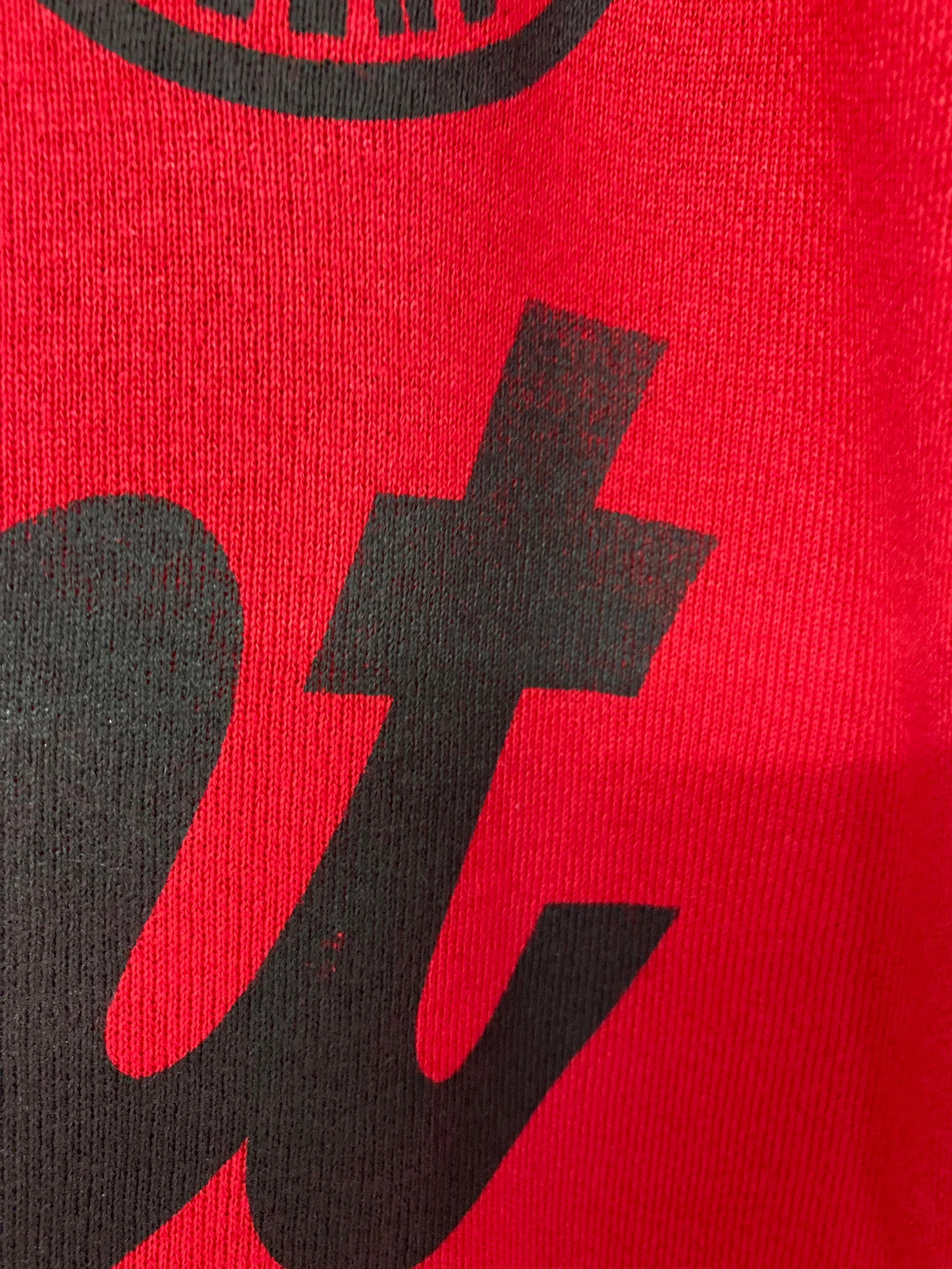 Hand screen printed on a red preloved vintage sweat with black eco ink.