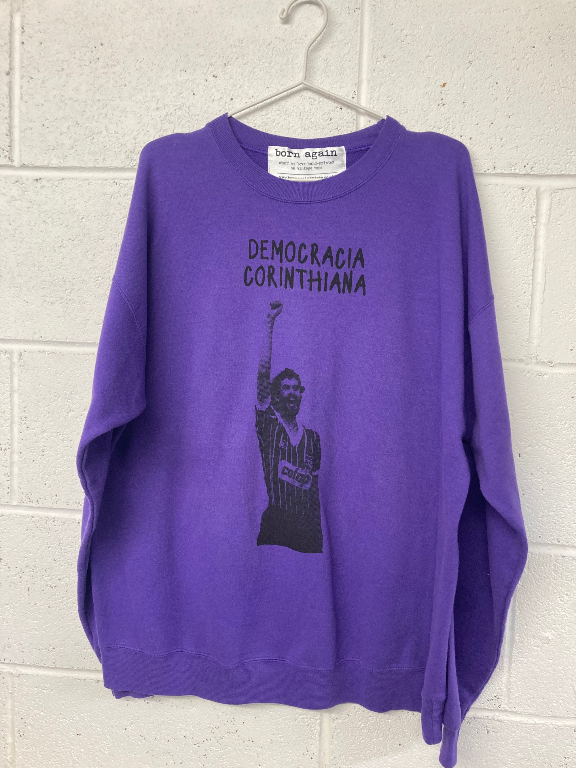 Hand screen printed on a purple preloved vintage sweat with black eco ink.